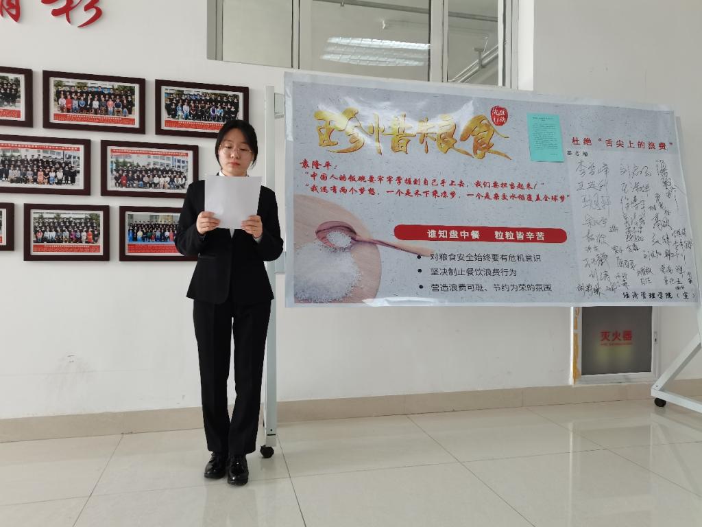 紧接着,进行第二项议程,由伟德国际victor1946员工代表赵书毓宣读倡议书。“我们要自觉维护节俭用餐的良好风气,自觉抵制舌尖上的浪费,争做光荣的“光盘”族。积极向身边的亲朋好友宣传节约粮食、拒绝浪费的做法,争做“节约粮食、拒绝浪费”的践行者、宣传者、推动者。”