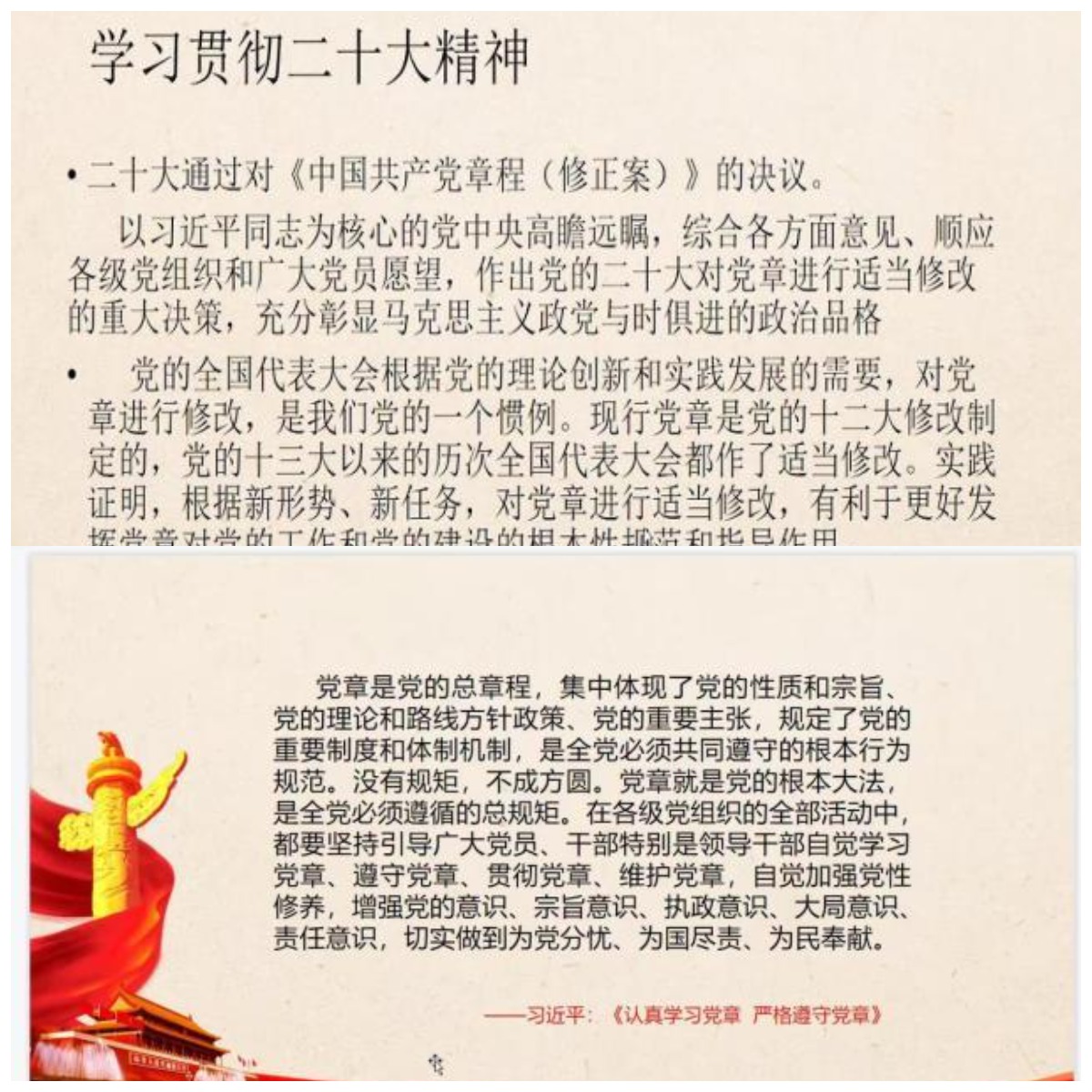 紧接着,李静书记为大家讲解中国共产党党章建设历程,十九大、二十大党章修改的主要内容,使员工党员明白了党章是党的总章程,集中体现了党的性质和宗旨、党的理论和路线方针政策、党的重要主张。更加加深了员工党员们对党的了解,使其更加坚定了成为一名合格党员的决心。同时,员工党员们发现自身还有很多不足之处,今后应该加强自身修养,学习党的最新思想,关注党的最新动向,早日成为一名合格的共产党员,为人民服务!