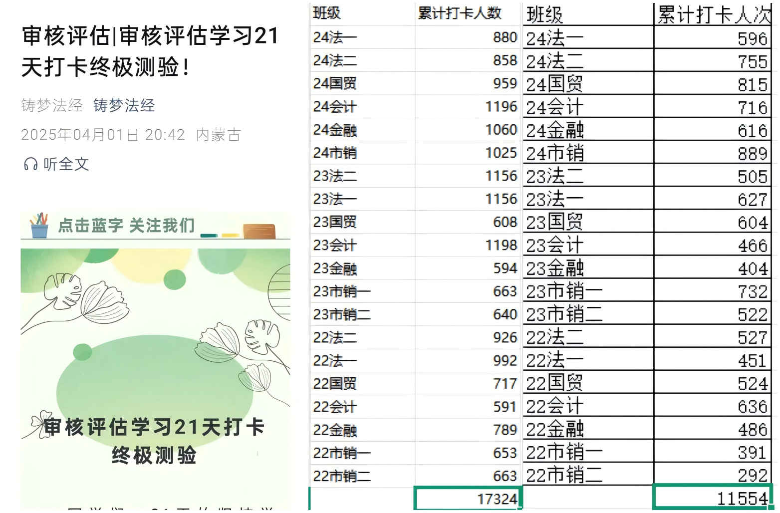 活动主要包括“21天学习打卡挑战”和“学风监督员”两项。一是通过线上小程序坚持每日专业课学习打卡,员工们积极参与,坚持分享学习心得、学习笔记、学习照片等,累计打卡次11554人次;同时,依托“铸梦法经”微信公众平台,每日推送“评估知识胶囊”,师生共同学习评估知识,累计打卡次数达到17324次。二是推行学风监督员制度,探索建立教学联动——党员参与——监督反馈机制,选派党员教师、优秀员工干部进行监督检查,与任课教师形成有效合力,减少了迟到、早退、旷课等不良现象,学习氛围日益浓厚。